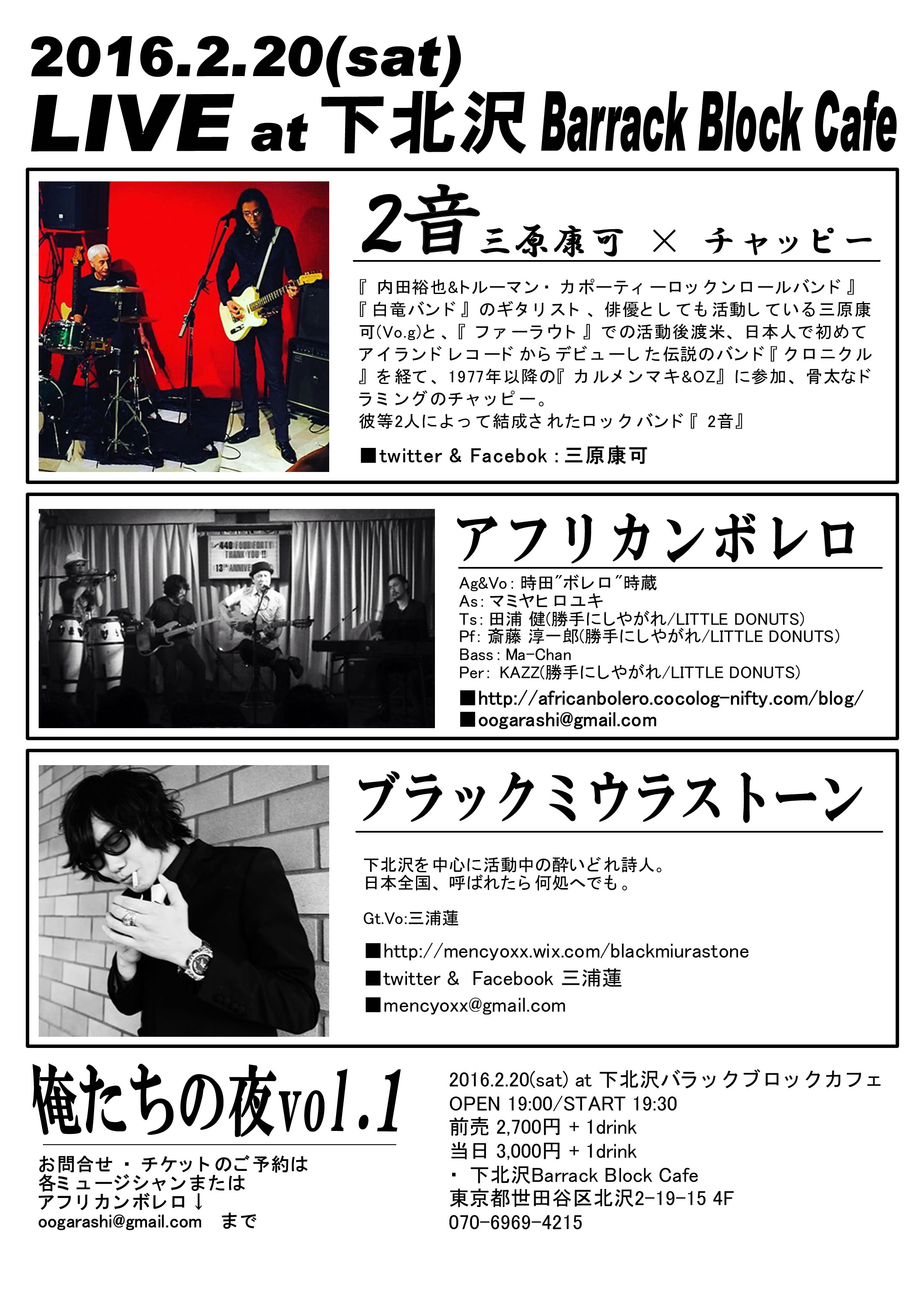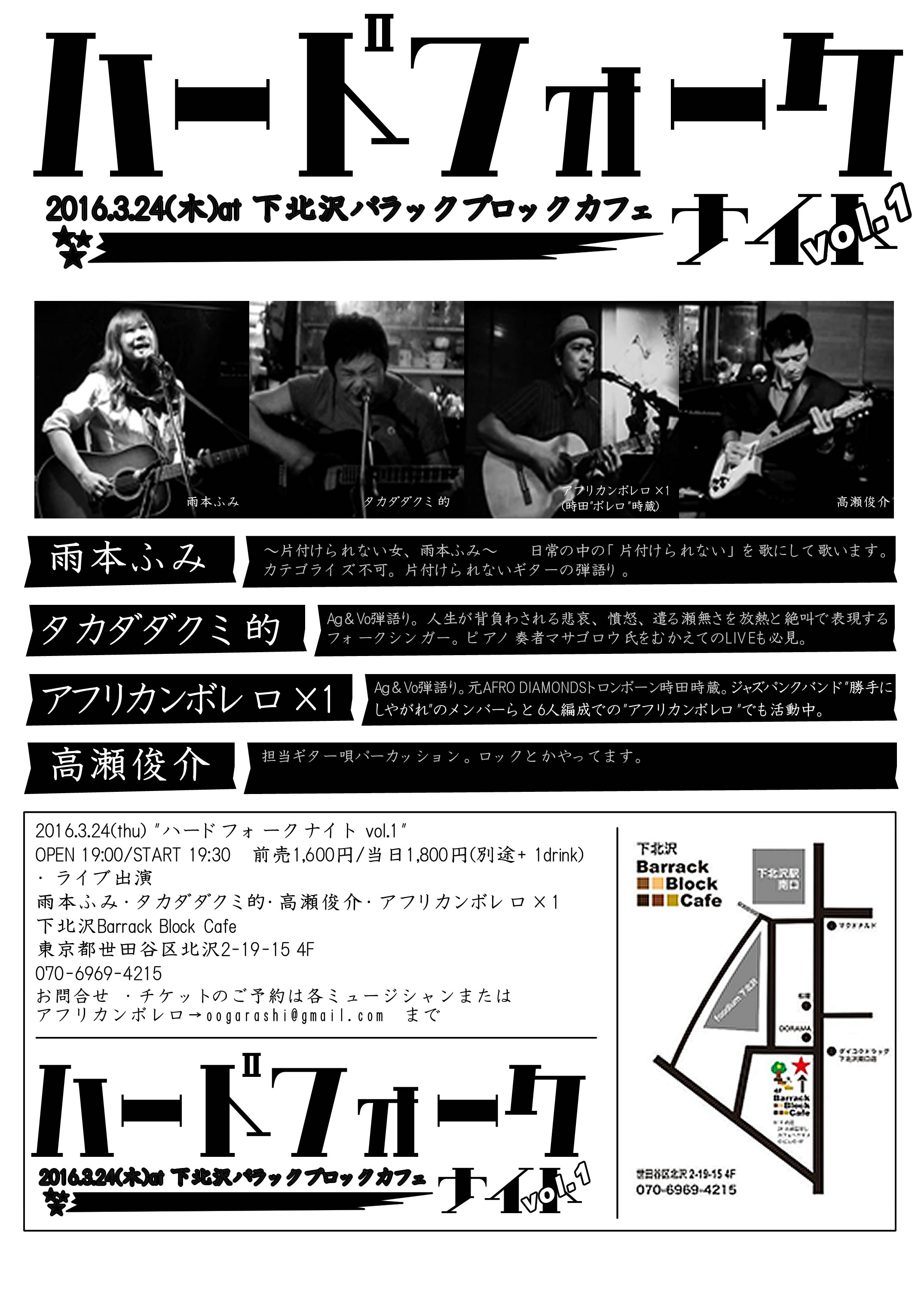 ※すみません。現在募集しておりません。 下北沢barrack block cafe(バラックブロックカフェ)で開催する、ノルマなしライブ、オープンマイク、ライブイベント"ハードフォークナイト""シモキタ・ジャズナイト""シモキタ・ボサノバナイト"はアフリカンボレロの時田"ボレロ"時蔵が企画・運営しています。 出演希望やお問い合わせは、アフリカンボレロのAg&Vo:時田"ボレロ"時蔵までお願い致します。 ノルマなし、初心者の方の初めてのライブからサポート致しますので、お気軽にお問い合わせ下さい! ■出演希望&お問い合わせ イベント企画者のメールアドレスまで、ご連絡下さい。 可能であれば、MP3やYouTube動画などで音源を確認させて頂けると嬉しいです。 (なくても大丈夫です) 音質や画質は、特に良くなくても大丈夫です。 ■アフリカンボレロ ・URL:http://africanbolero.cocolog-nifty.com/ ・Twitter:https://twitter.com/africanbolero ・Facebook:https://www.facebook.com/africanbolero/ ★リンク★だってそれ、気になるもの |